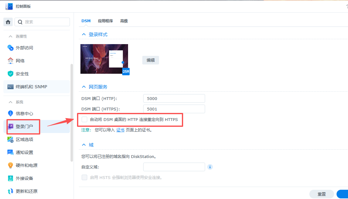其他问题群辉重定向失败怎么处理?群晖 NAS 5001 端口 HTTP 重定向 HTTPS 错误提示 群晖映射后出现重定向错误。 原因: 群辉配置不对 解决方法 若本地服务为 HTTP,请在管理后台将端口改为 5000; 若本地为 HTTPS, 请在 控制面板/系统/登录门户 里把 自动将 DSM 桌面的 HTTP 连接重定向到 HTTPS ,端口可使用 5001。