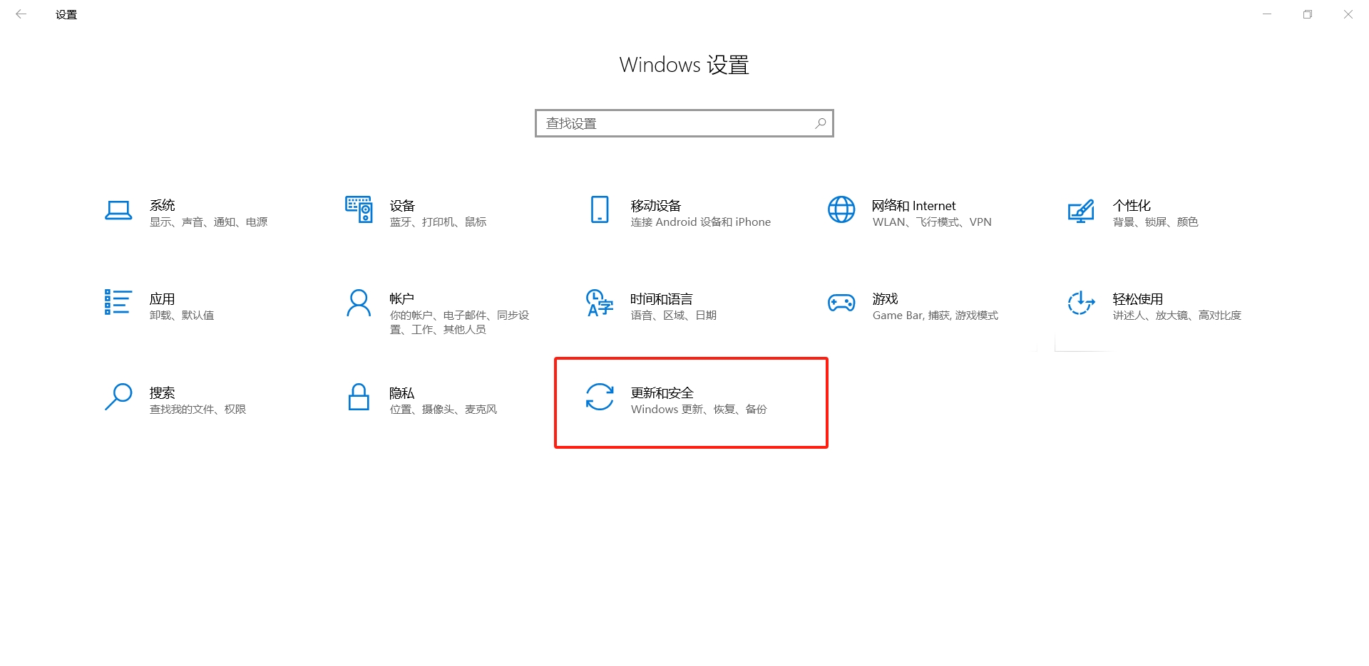 1、 打开windows 设置,然后找到并打开 更新和安全