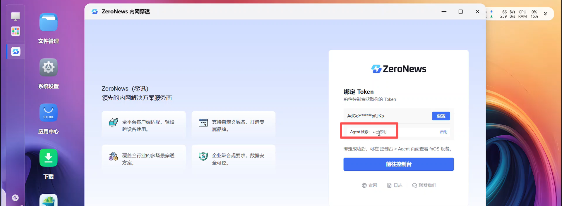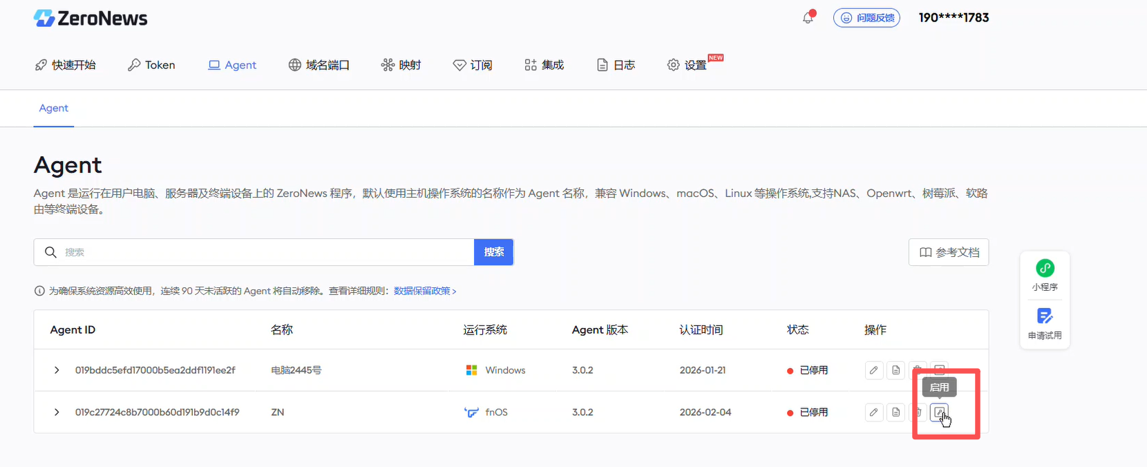 - 在ZeroNews控制台找到飞牛Agent并点击右侧的启用