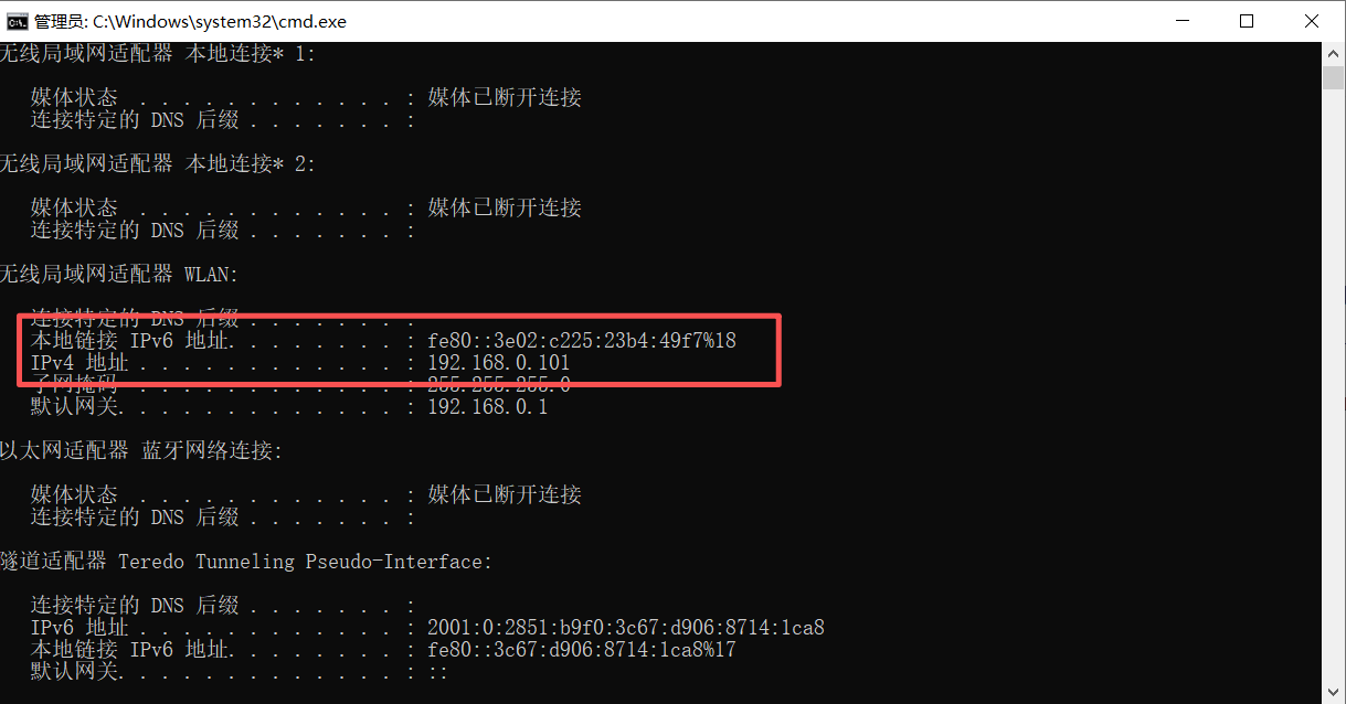 在显示的结果中,找到“无线局域网适配器 WLAN”(无线网络)或“以太网适配器 以太网”(有线网络)部分