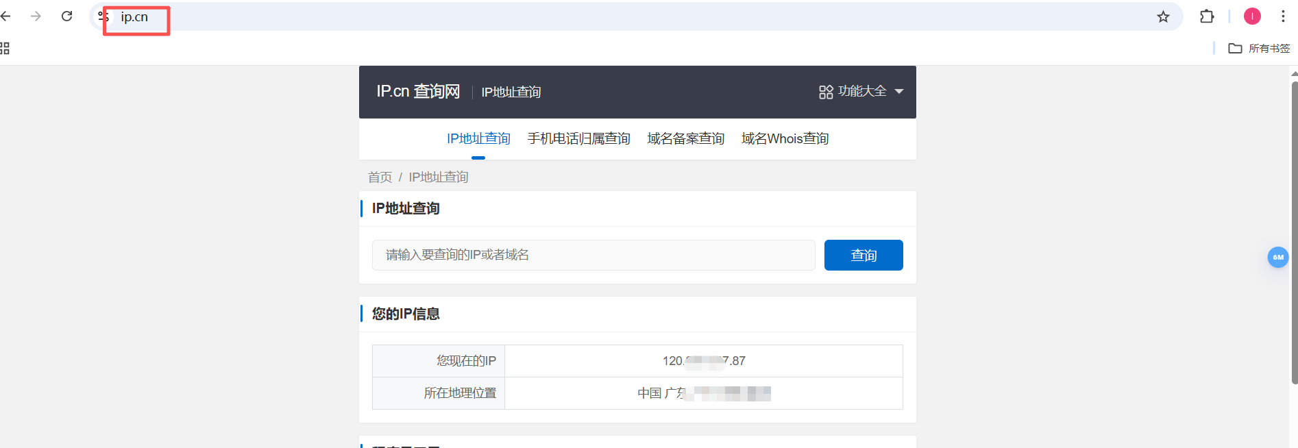 访问后,页面会自动显示你当前的公网IP地址、运营商和大致地理位置