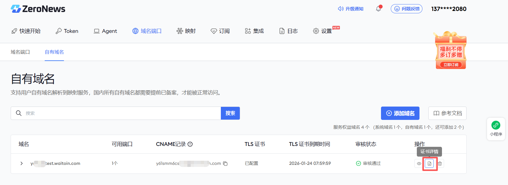 ① 首先在快到期的自有域名,右侧点击证书详情。