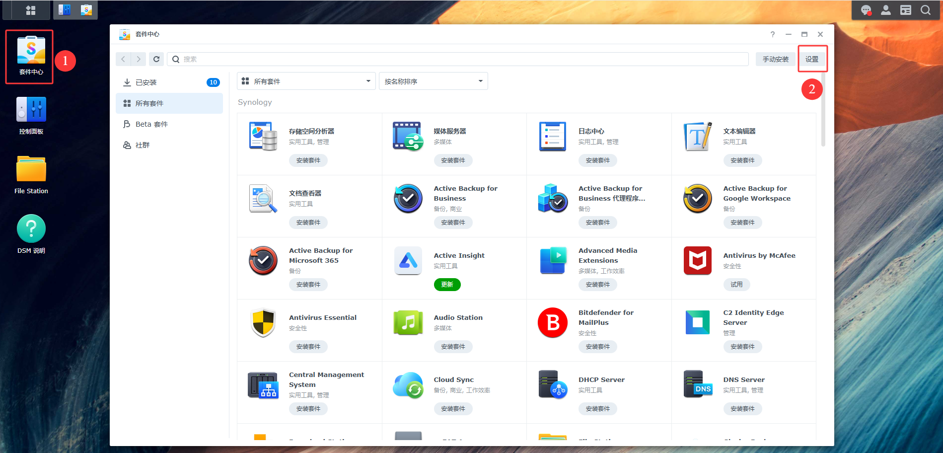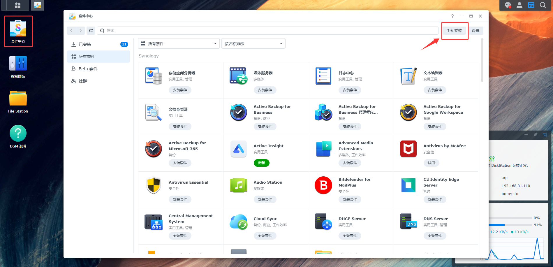 目前支持两种安装方式: 套件中心安装 和 手动安装