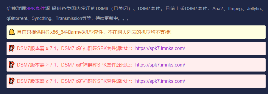 矿神套件(DSM_7+):「套件中心」设置套件来源:https://spk7.imkns.com 官方套件下载:(不支持32位)