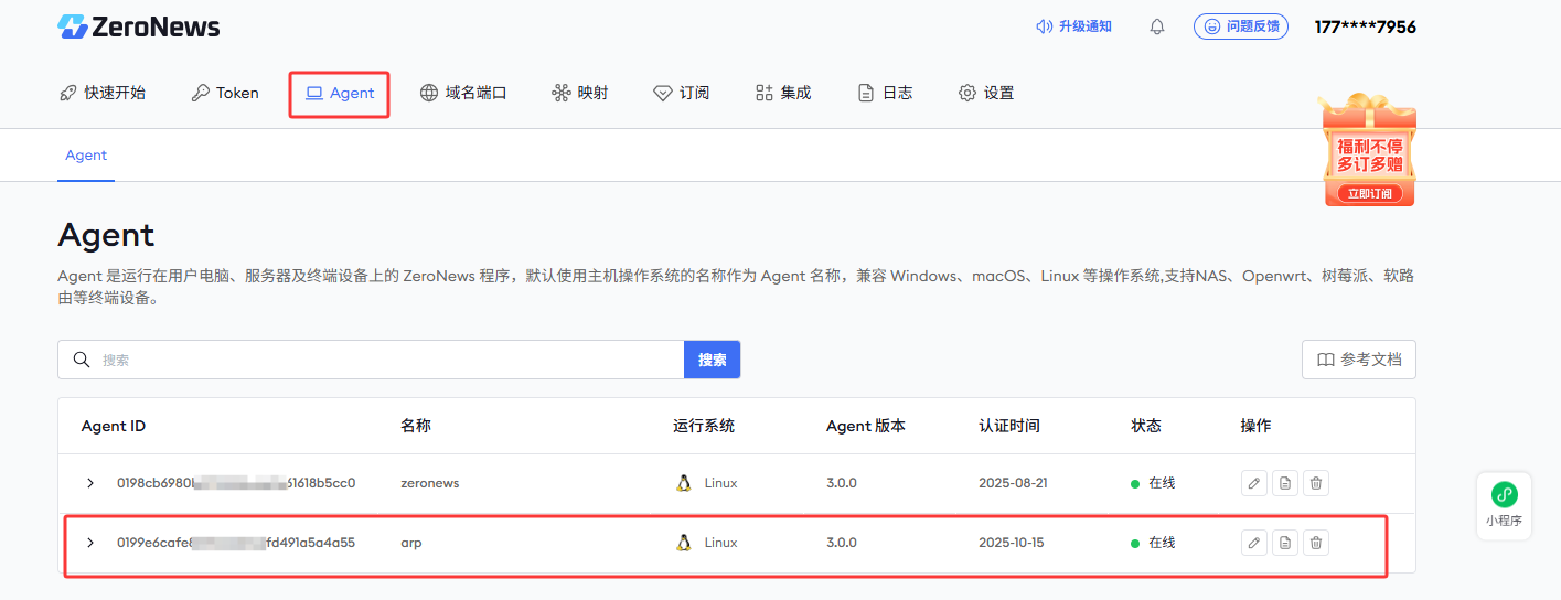 安装完成后,回到 ZeroNews 平台,Agent已经显示在线。