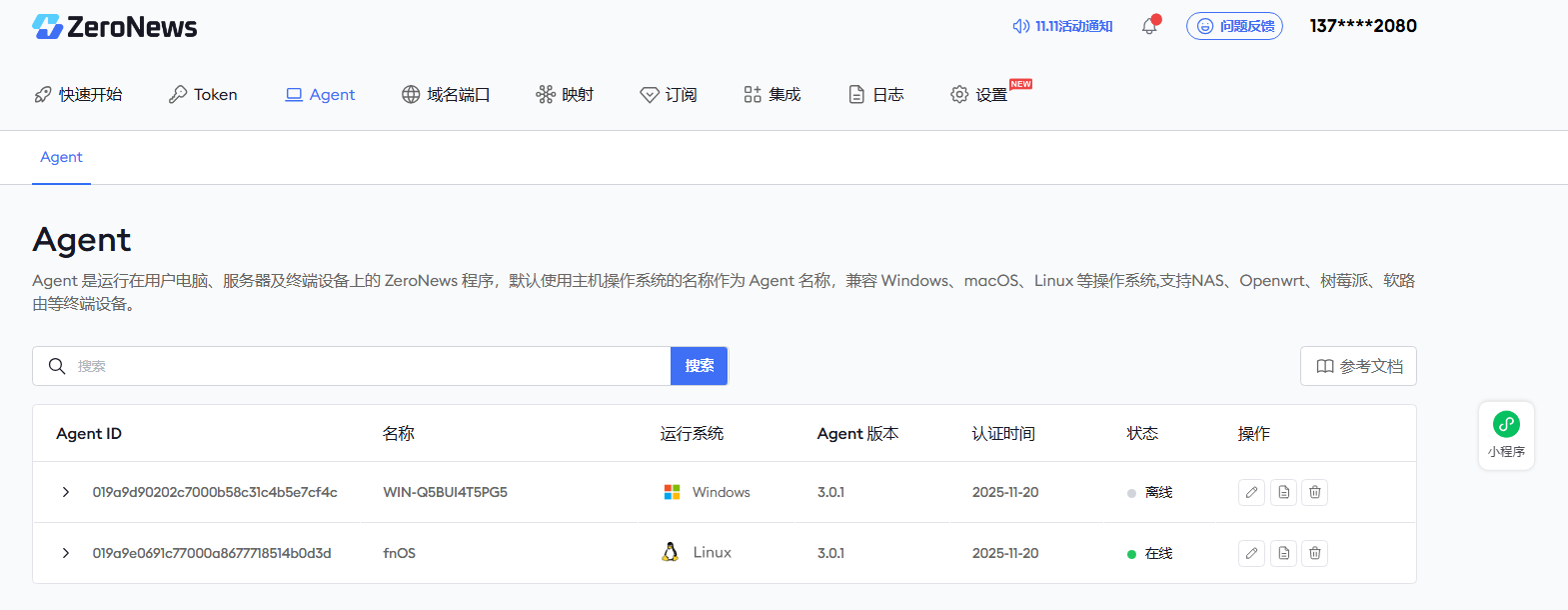 ZeroNews 容器启动成功后,在 ZeroNews 平台上,可以查看已上线的 zeronews Agent
