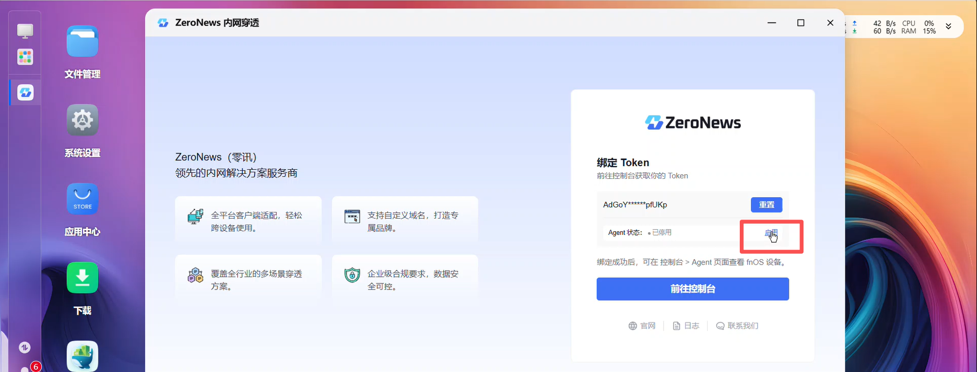 1. 在ZeroNews控制台找到飞牛Agent并点击右侧的启用