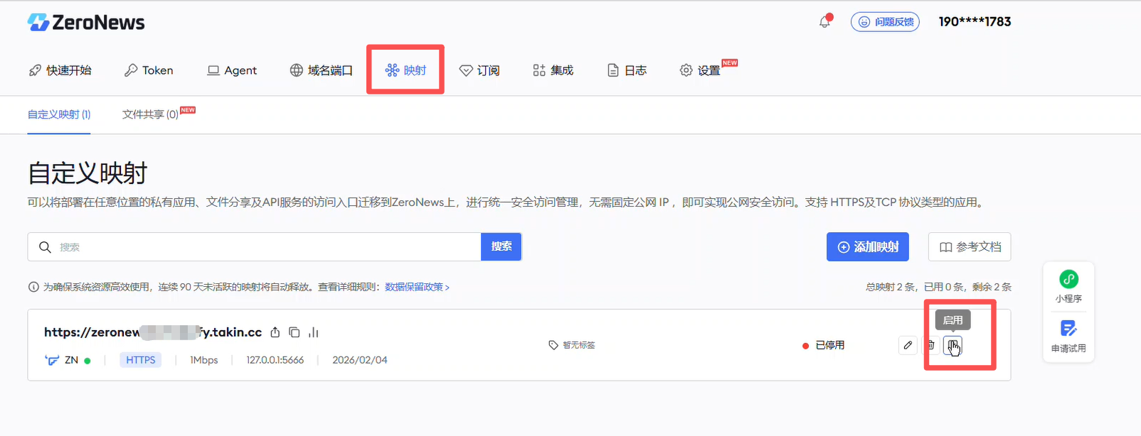 1. 如该Agent有配置映射,则需要回到ZeroNews /映射页面,找到对应的映射,并启用