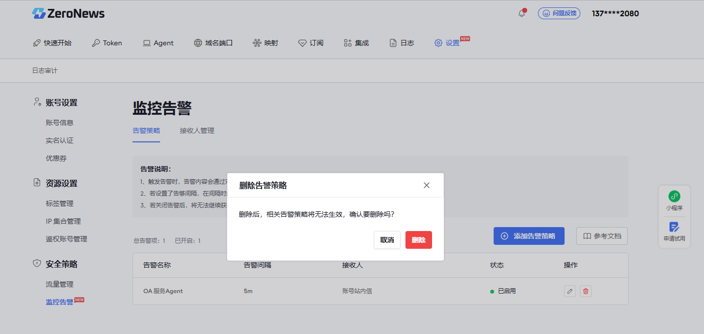 ② 点击删除,将会删除掉该告警策略,并且原有告警规则将失效;