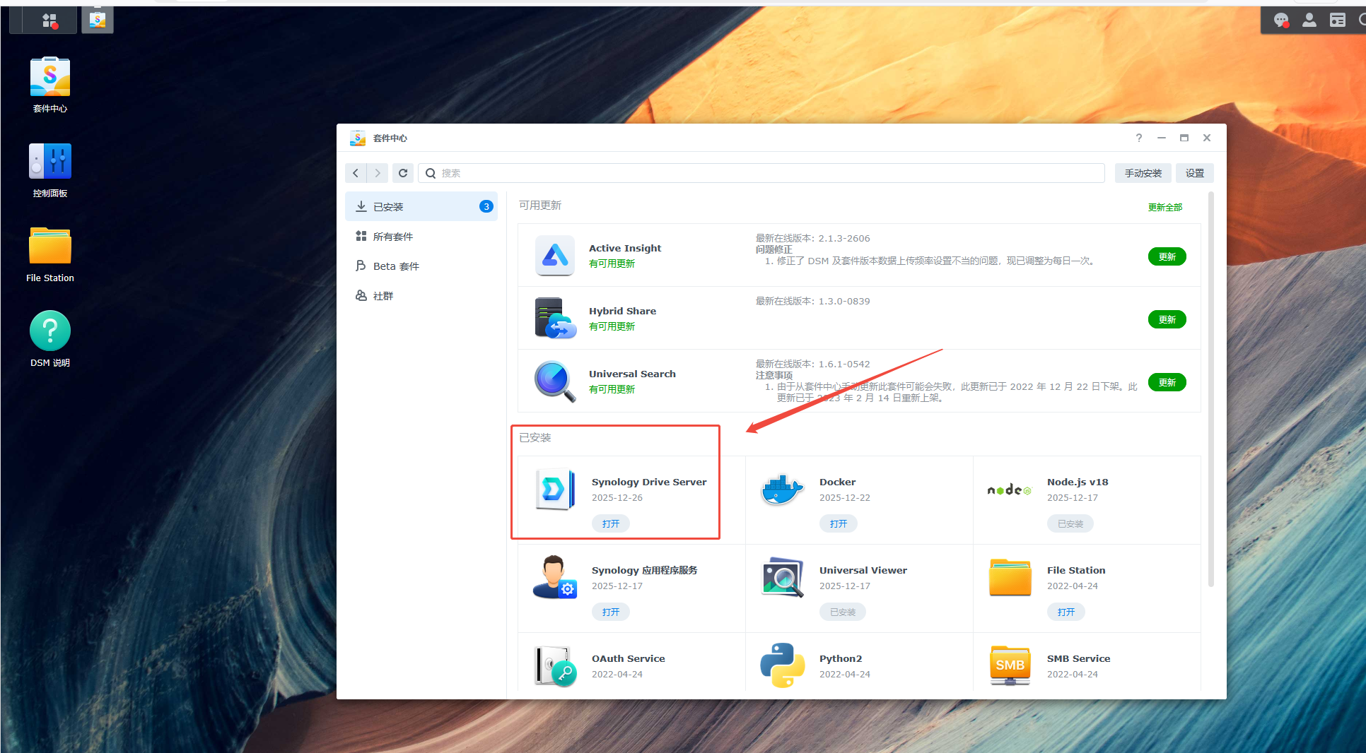 等待套餐安装完成后,在已安装的页面下,能查看已经安装好的 Synology Drive Server 套件