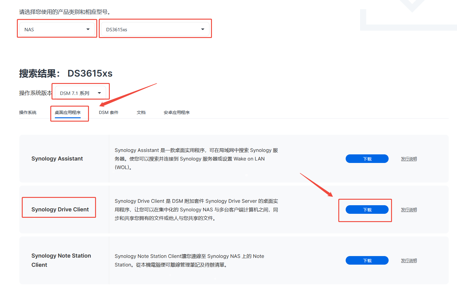 然后再搜索结果中选择操作系统版本, 我的 DS3615xs 版本是 DSM 7.1 ,所以在这里选择 DSM 7.1,再点击下方的桌面应用程序,找到 Synology Drive Client 进行下载