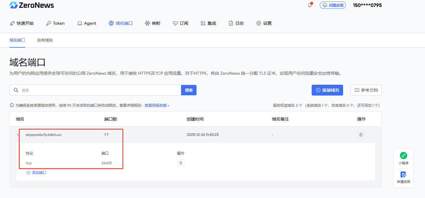 域名端口添加完成后,在域名页面可以查看添加好的域名及端口
