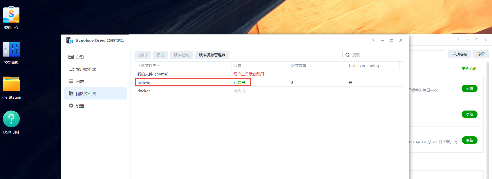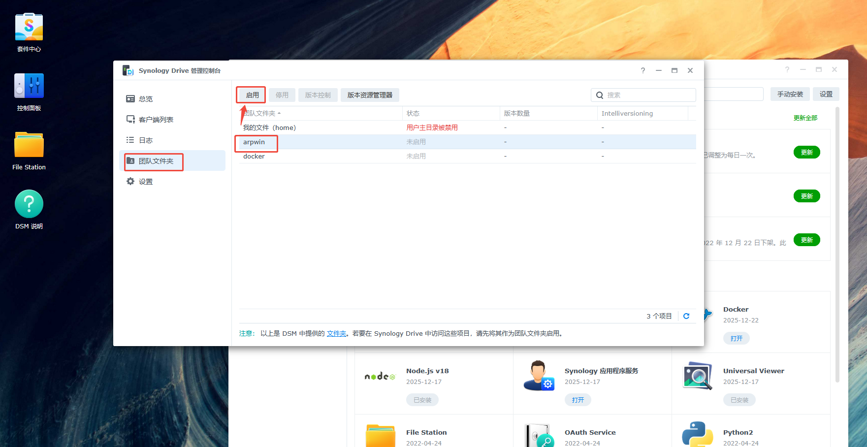 然后打开Synology Drive Server 套件,在团队文件夹菜单中,选中刚添加好的文件夹,点击上方的 启用 按钮,在团队文件夹中启用该文件夹