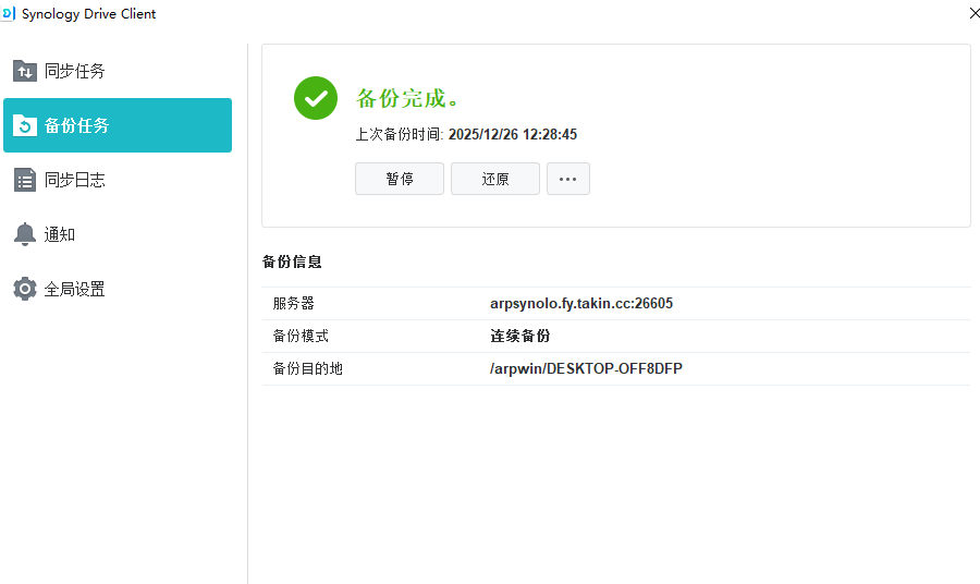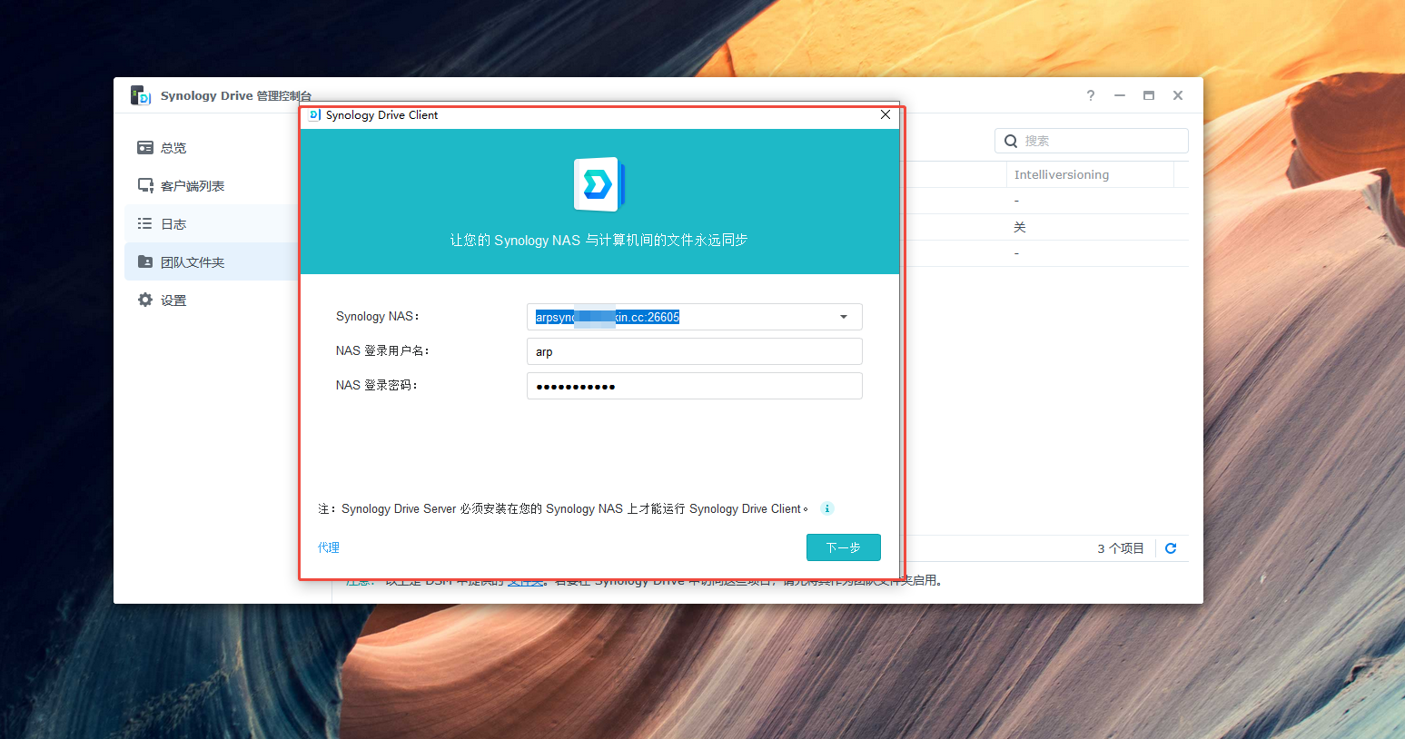 打开 windows 上安装好的 synolog drive client 客户端, 在 Synology NAS 输入框中输入前面添加的 Drive Server 映射的地址 arpsynolo.fy.takin.cc:26605