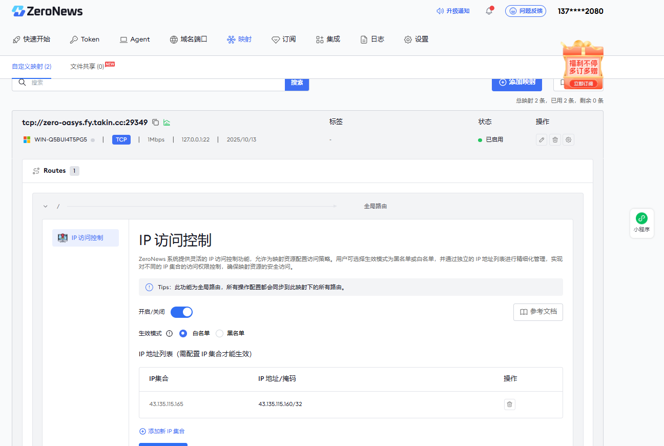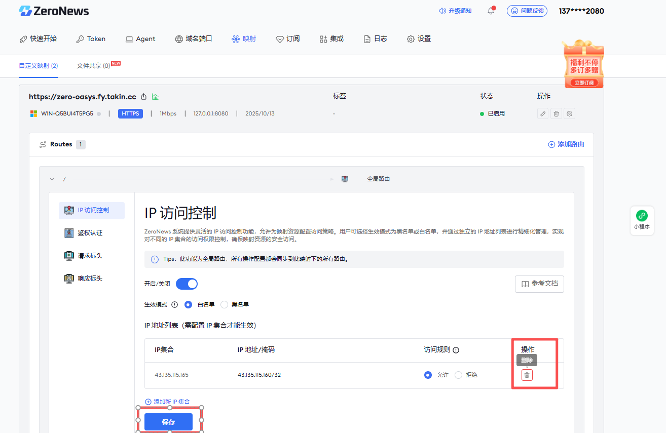 | 访问规则 | 允许:集合IP可访问映射,拒绝:禁止访问, 多规则按添加顺序四配规则 |