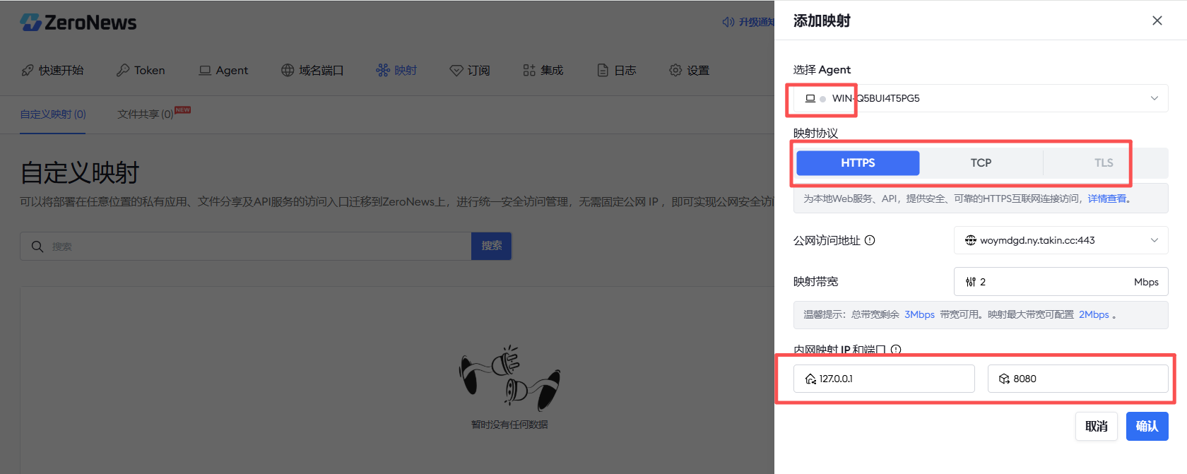 其他问题映射无法访问?无法访问此网站 现象: 在打开映射时,提示“无法访问此网站”。 原因: 映射服务未正常启用 解决方法 确认 Agent 是否在线; 确认局域网内本地服务是否可正常访问,例如:您的内网服务为 127.0.0.1:8080,通过内网可以正常访问; 检查映射配置是否正确(协议、内网端口、内网IP)。 若上述都正常,还是无法访问,请联系客服和技术支持。