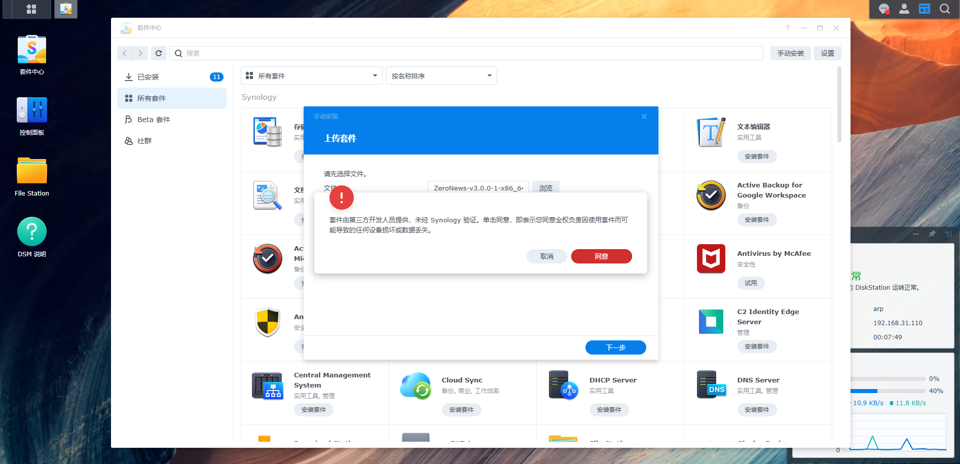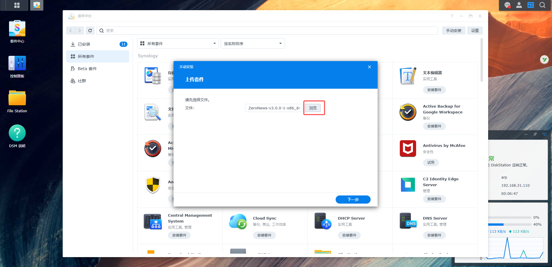 2. 点击「上传套件」,选择对应系统架构版本的SPK包,按照指引继续完成安装;