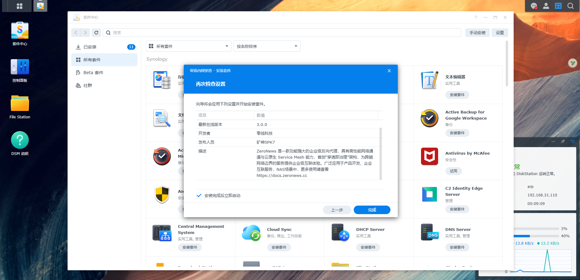 选择套件中心一键安装ZeroNews,为您带来以下便利: