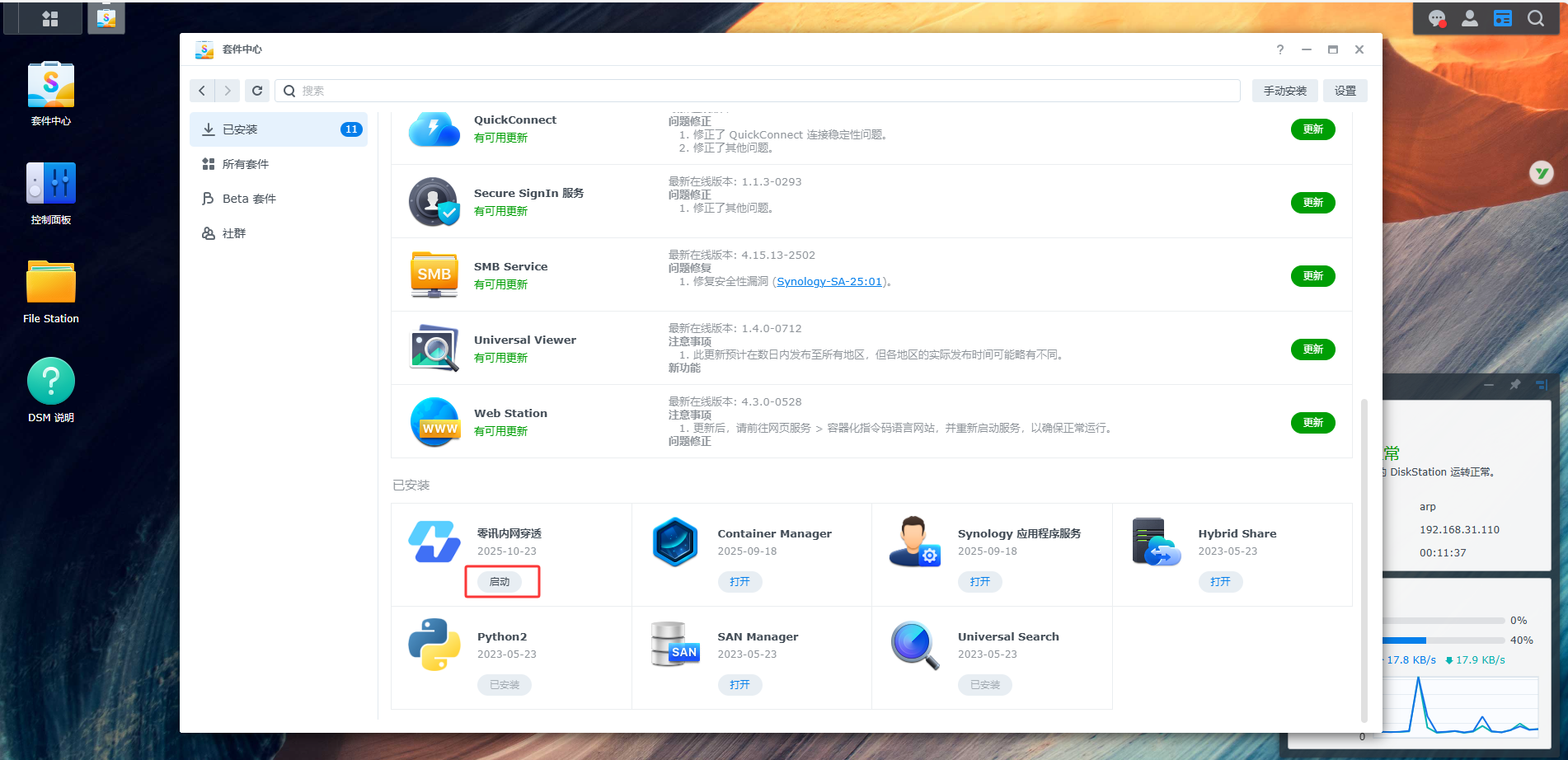 6. 在已安装界面点击“启动”,或者在桌面点击 零讯内网穿透 图标,启动套件即可。